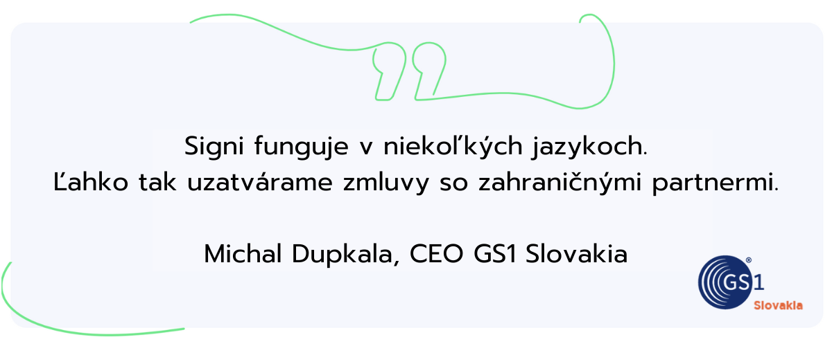 Elektronický podpis využíva GS1 Slovakia pri registrácii zákazníkov, uzatváraní partnerských zmlúv, ako aj v rámci interných procesov. Na registráciu zákazníkov používa štandardizovanú šablónu. Zmluvy s partnermi manuálne nahráva do Signi. Jazyky sú tu veľkým benefitom – zahraničný partner sa pri podpise v aplikácii ľahko zorientuje. Digitálne dokumenty majú preňho ešte jednu výhodu navyše. „Keď zašleme zmluvu digitálne, dostávame k nej menej komentárov, než k papierovému dokumentu. Partner má väčšiu motiváciu podpísať ju tak, ako je. Samozrejme, komentárom sa nebránime, no rýchlosť a jednoduchosť pomáha,“ vysvetľuje Michal Dupkala.
