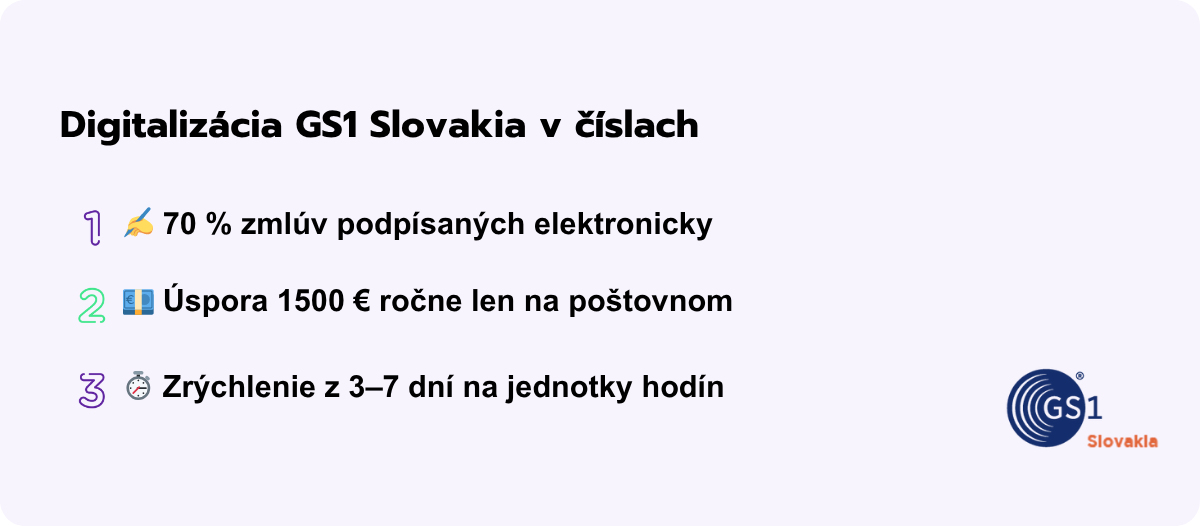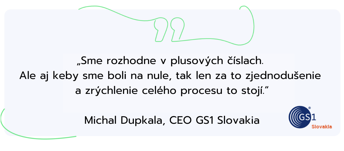 „Spracovávame veľké množstvo malých transakcií. Kedysi sme zmluvy s klientmi zasielali len poštou. Občas sa vracali od klientov neskoro, niekedy nedorazili vôbec,“ spomína Michal Dupkala, CEO GS1 Slovakia. Uzatvorenie zmluvy tak trvalo približne 3–7 dní.