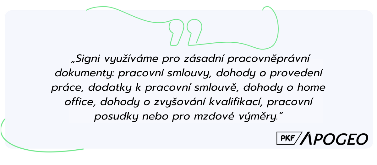 Děláme vše pro to, abyste vy nemuseli. Motto, které provází PKF APOGEO v Česku již 24 let. Poradenská společnost nabízí svým klientům služby v mnoha oblastech, od HR, mezd, auditu, daní, účetnictví, oceňování, strategií až po zakládání a správu firem. Společnost je součástí mezinárodní sítě PKF Global, kterou tvoří 530 kanceláří poskytujících komplexní poradenské služby ve 150 zemích. S pobočkami v Praze a Brně a 140 zaměstnanci se PKF APOGEO řadí ke středním firmám. Společnost už více než rok využívá k uzavírání dodavatelských smluv elektronický podpis. Od prosince 2023 se také rozhodla přejít na digitální HR. Nyní využívá HR systém Alveno s podpisem od Signi. Jak hodnotí rok s elektronickým podpisem?