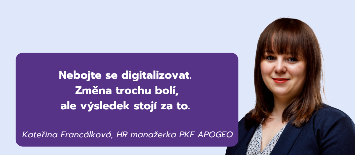 Jako poslední přistoupili v PKF APOGEO k digitalizaci HR. „Byli jsme ona pomyslná kovářova kobyla,“ s nadsázkou glosuje Kateřina Francálková, HR manažerka PKF APOGEO. „Teprve novela zákoníku práce z října 2023 však umožnila digitalizovat všechny HR dokumenty,“ doplňuje. K digitalizaci HR agendy zvolili v PKF APOGEO systém Alveno. „Jedná se o přehledný systém, ve kterém najdeme veškeré HR informace. Šetří hodně času a administrativy,“ hodnotí Kateřina Francálková. „Přidanou hodnotou byla také tehdy čerstvě navázaná spolupráce Alveno a Signi,“ dodává.